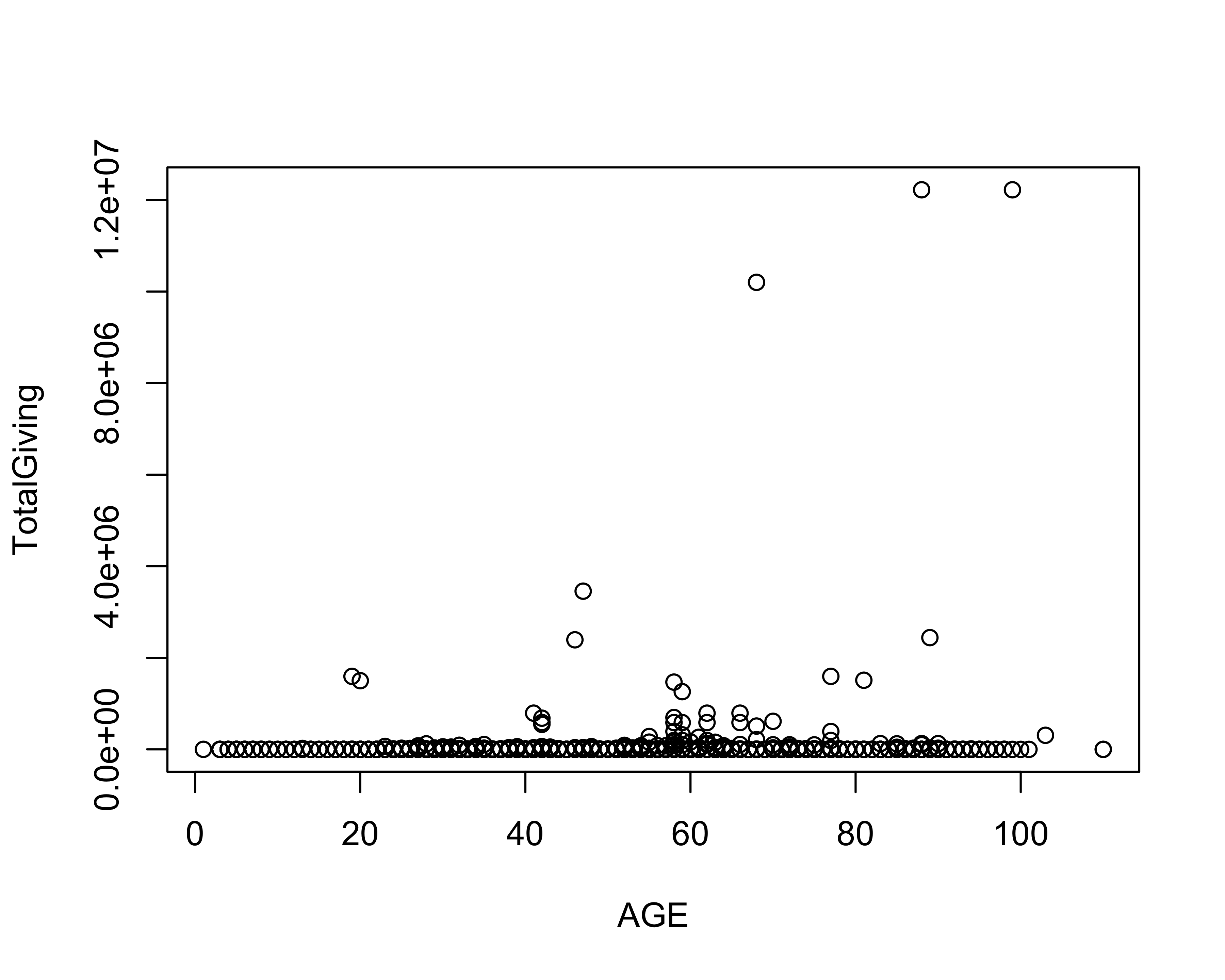 Based on the table output, there are 13,075 non-donors and 21,433 donors. Even though the majority (62%) of constituents are donors in this dataset, it is important to note that this is an artificially generated dataset and that your mileage (that is, donors per constituent record) will vary based on your institutional activity and transactional record.