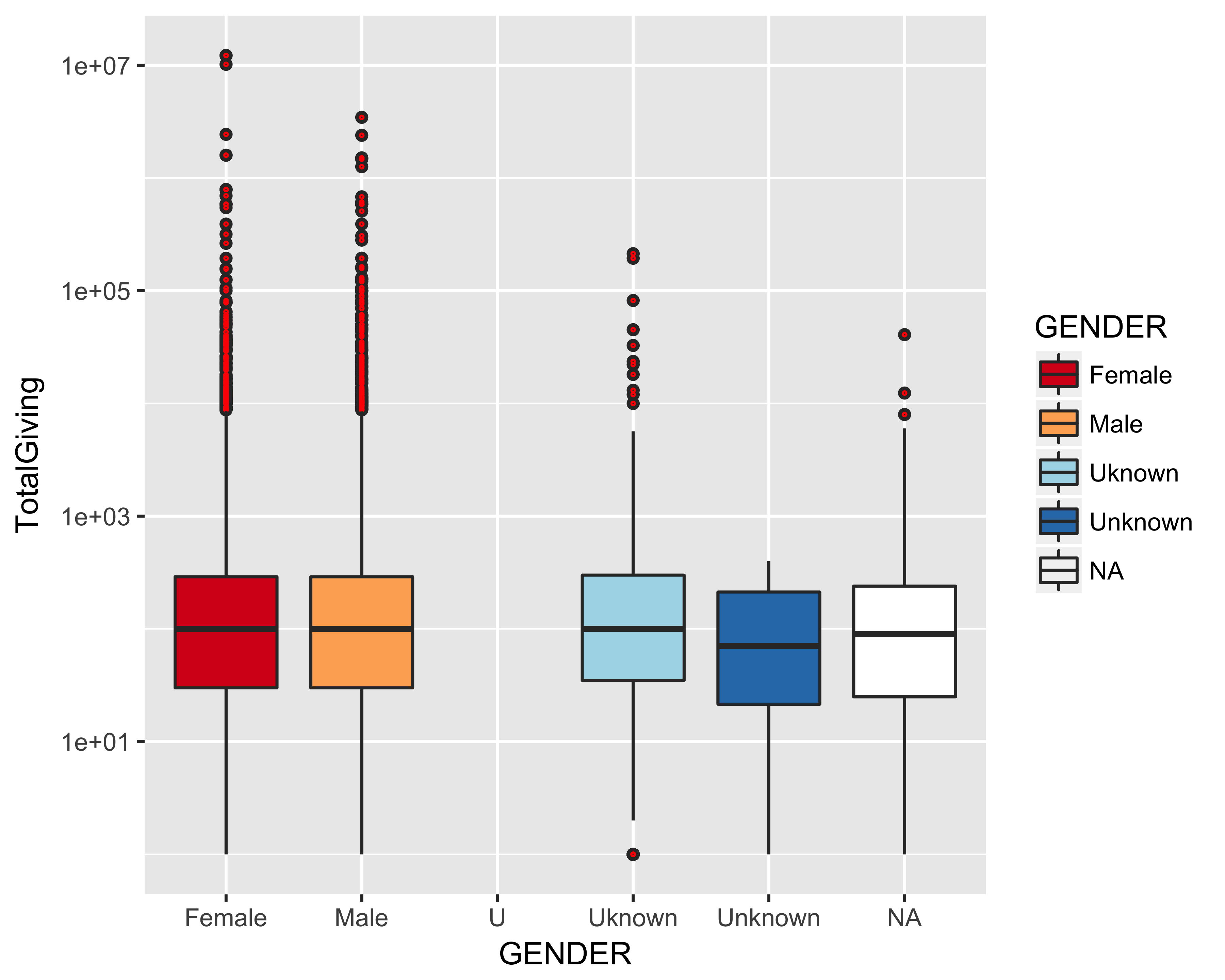 #> [1] 25It’s the tale of two averages. Using the mean function, we can see that the average gift size (mean) in our donor file is $2,364, and the median is $25. Let’s further explore and compare both statistical measures of average gift size in this example.