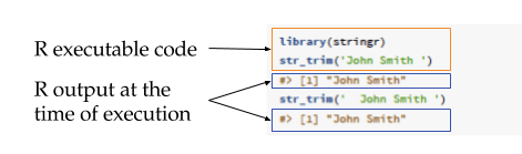 You will notice that the code chunks are in a grey box and R code is highlighted, and the output is shown in orange. The output in the book always begins with #> characters. Since # denotes the beginning of comments in R, you can safely copy the output on your console. (The output in your console will show up without the #> characters.)
